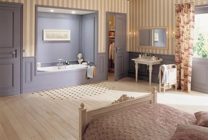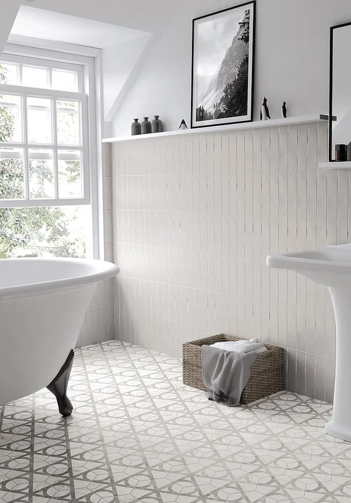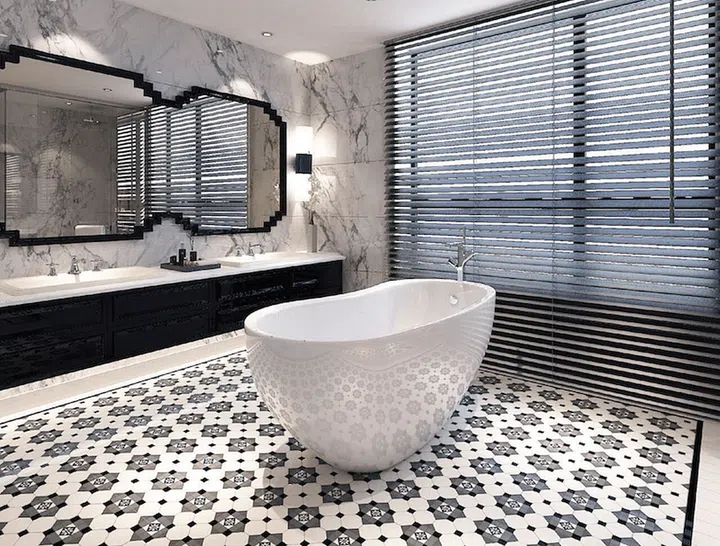 Draw the Line: Outlining patterned tiles with borders highlights zones. Much like a rug, the starburst patterns pictured are defined by a bold, black line. This instantly places the bathtub, the star of the space, in the spotlight. Available at GF+A Global.