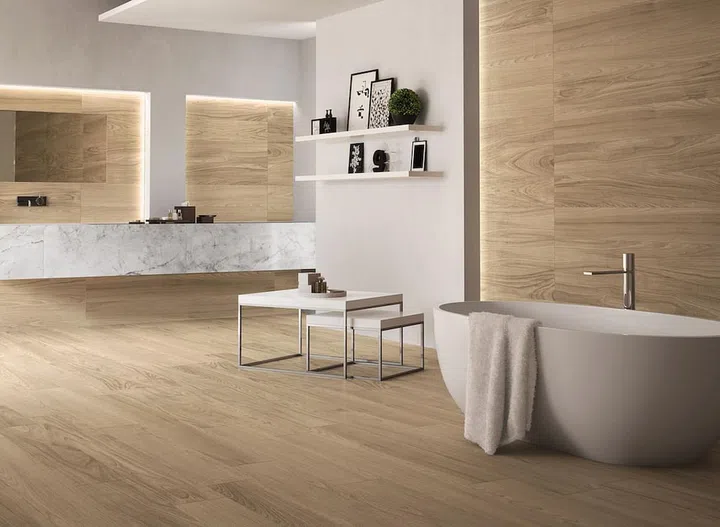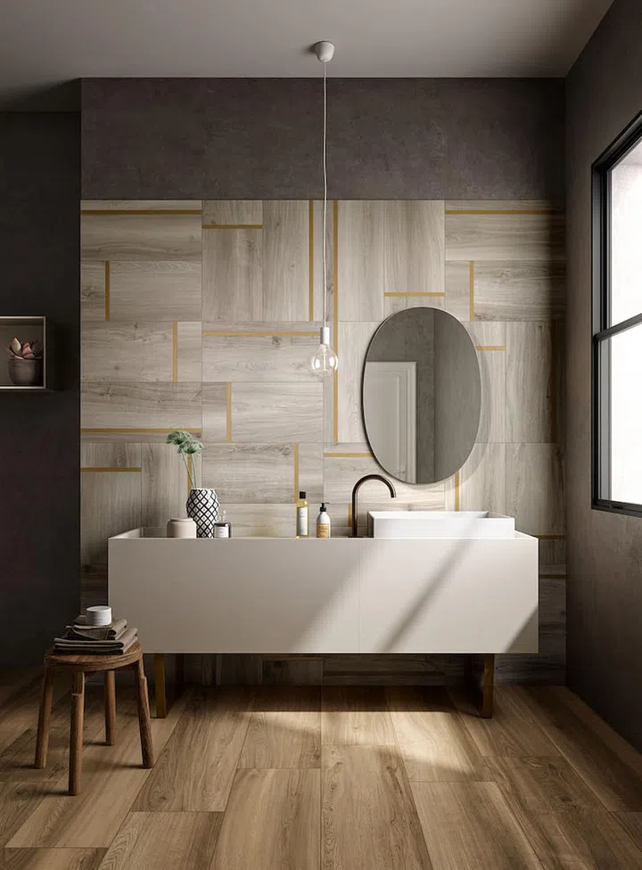 Get Real with the Natural Look: With the biophilia trend going strong, natural- looking textures continue to be in favour. Opt for hyper-realistic wood patterns with high variation – like the Nuance tiles by Panaria. To create the illusion of a larger bathroom, use the same tiles on the lower portion of the bathroom wall. Available at Rice Fields.