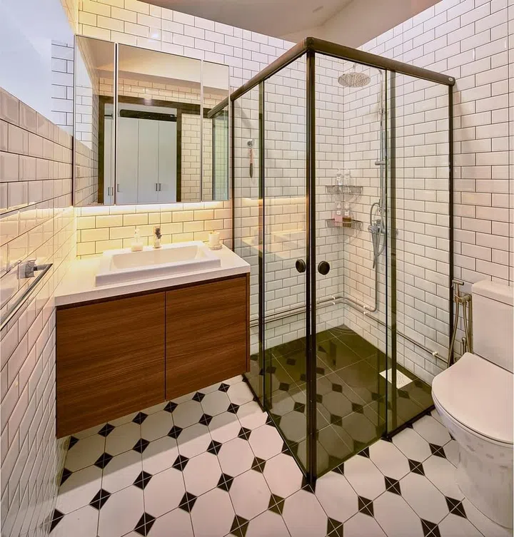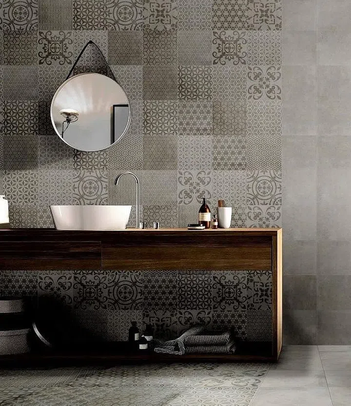 Celebrate Bold Patterns: With dark colours like black and navy blue entering living spaces, deeper hues are set to appear in the bathroom too. Worried it might result in a gloomy space? Find the middle ground with dark-coloured patterns – Janette is a patterned tile mixing blue, white, black and grey. Available at Hafary.