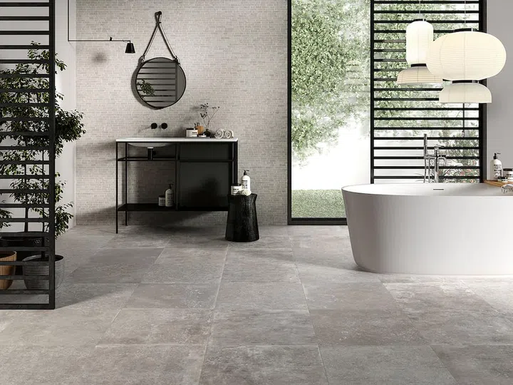 Opt for Cobblestone Charm: Embrace the beauty of wabi- sabi with shades and variations in tiles. The Rue De St Cloud porcelain tiles by Ascot Ceramiche are inspired by old- world European cobblestones. The visual texture brings a laid- back quality to the bathroom, signalling a time for rest when you enter the space. Available at Hafary.