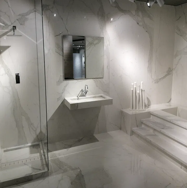 Show Off White Marble: White marble continues to charm with its crisp look and feel. Invite more natural light into the space, with the high shine of the Maxfine Calacatta marble by FMG reflecting light into dark corners. For the ultimate look of luxury, customise your bathtub, walls and even bathroom sink in the same marble finish. Available at GF+A Global.