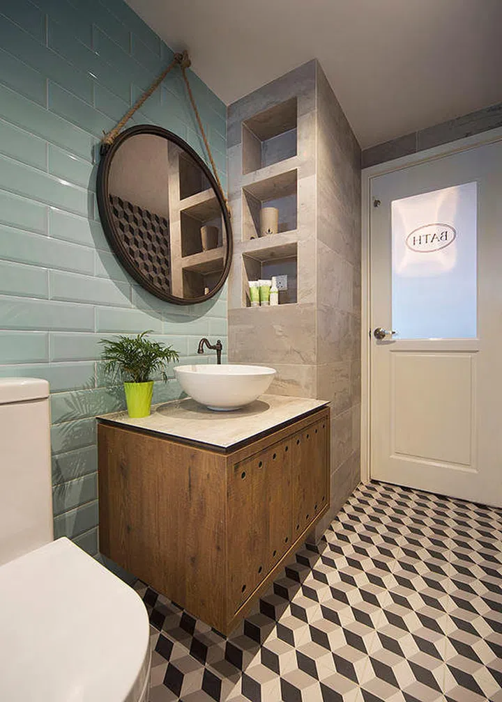 This bathroom is especially textural, not only with the turquoise subway tiles and patterned floor tiles, but the rope that the mirror hangs from too!