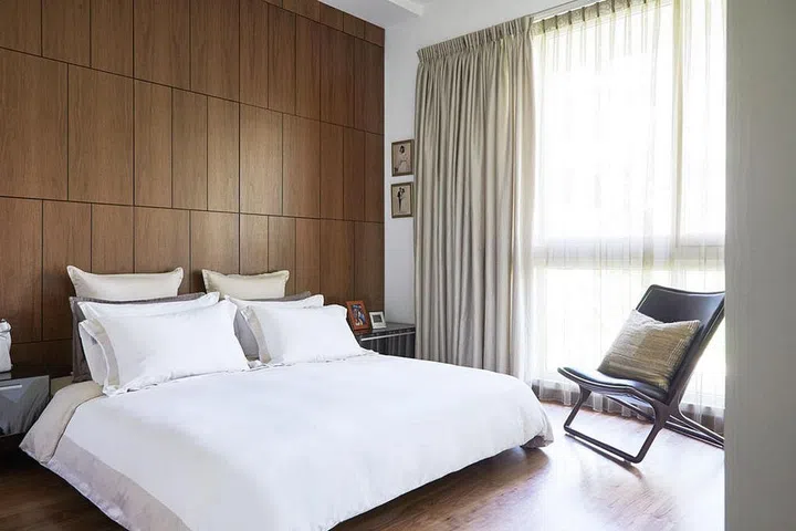 What looks like a feature wall in the master bedroom conceals a wardrobe and cabinets where she keeps her evening gowns, bags, and other knick-knacks.