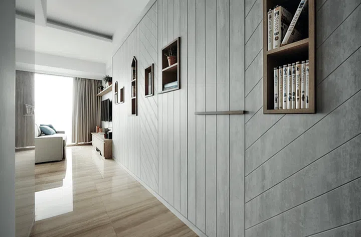 The wooden panels near the entrance of this home hide storage space for shoes and books. Groove lines on the panels were specially hand-cut.
