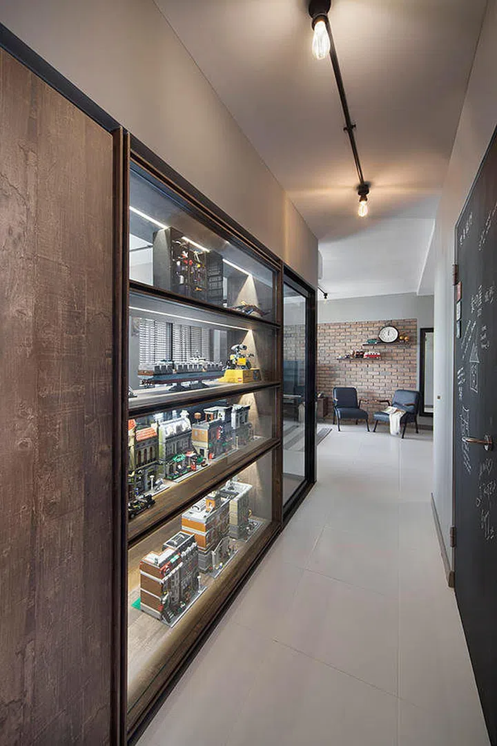 Personalising the space is a great way to soften up the look of an Industrial-theme home. The display wall created along this corridor helps to show off the homeowner's Lego-creations, adding a playful twist to an otherwise serious-looking walkway.