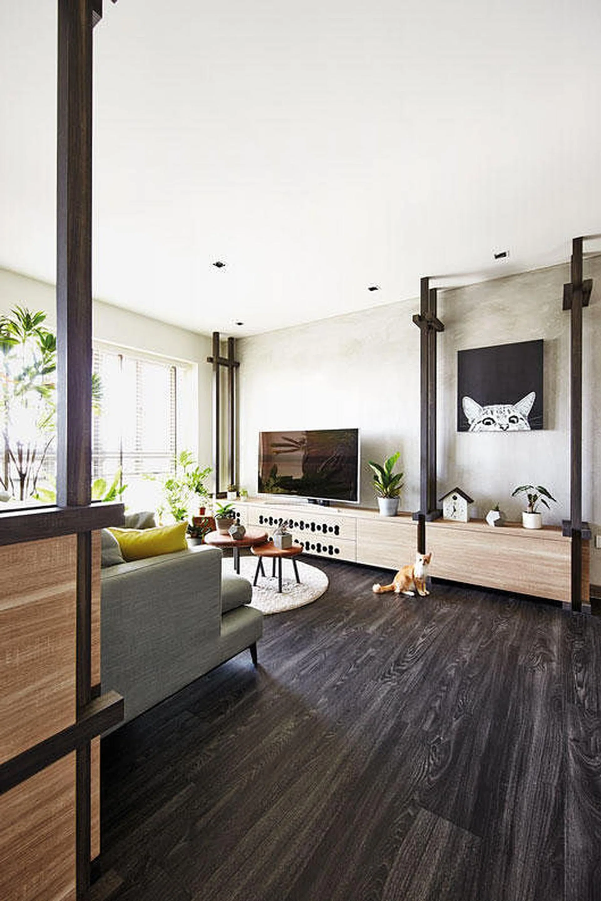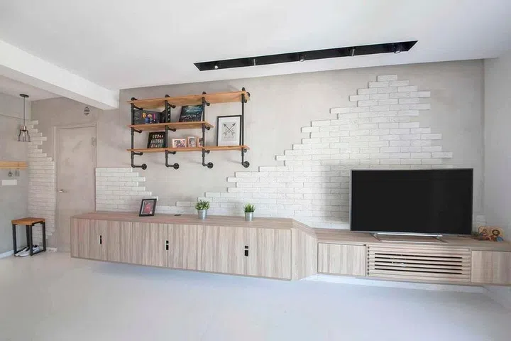 Intrepid designers can find ways to inject an element of fun and creativity into an Industrial-themed space. This living room looks unique and interesting thanks to the play of the brickwork on the wall, as well as the variation in the sizing of the cabinetry. The use of metallic piping to create the display shelf also adds character to the home.