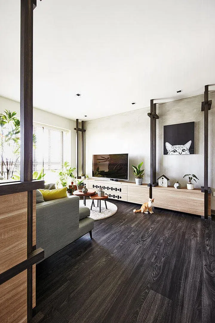 One way to avoid turning an Industrial-themed home into a cold space is to bring in signs of life, in this case the oversized painting of the family pet serves as a highlight in the living room. The furry form of the animal also helps to break up the straight lines in the room.