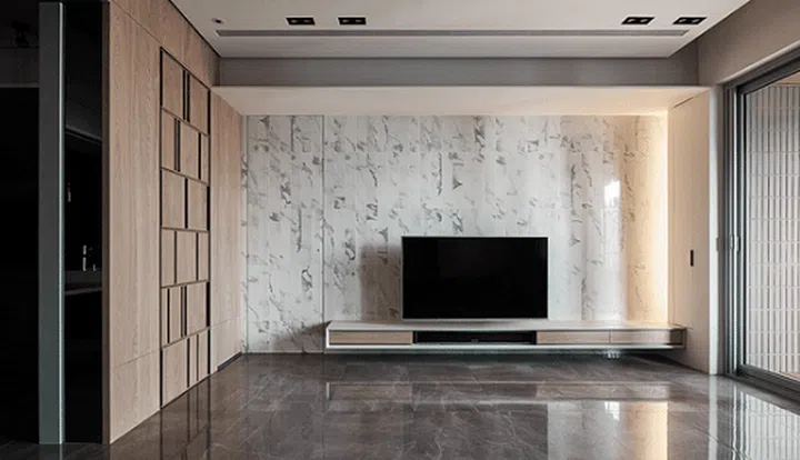 This white marble-look feature wall behind the TV console hides a door that leads into the bedroom. Spot the outline of the door on the left!