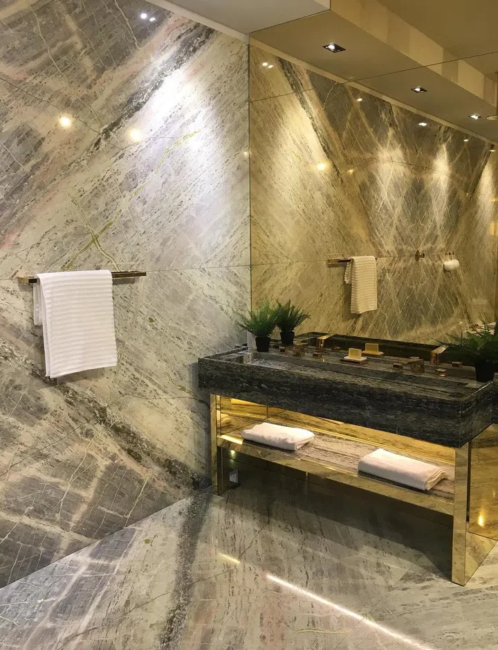 This bathroom setting in The Stone Gallery by Hafary showcases large marble-clad walls with intricate natural grains. The mirror reflects the unique pattern to create an impressive look.