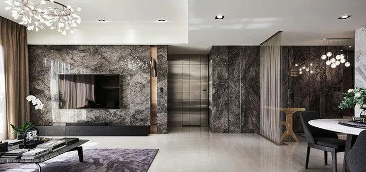 Pieces of Cherokee marble tiles are arranged in a Chevron pattern to create a unqiue feature wall next to the dining table in this apartment.