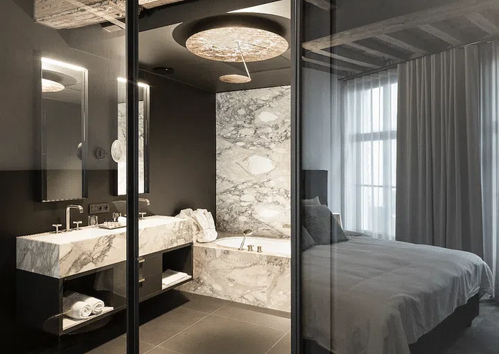 The Suitehotel Gulde Schoen in Antwerp, Belgium has a bathroom with a warm ambience and luxurious look thanks to the dark marble paneling.
