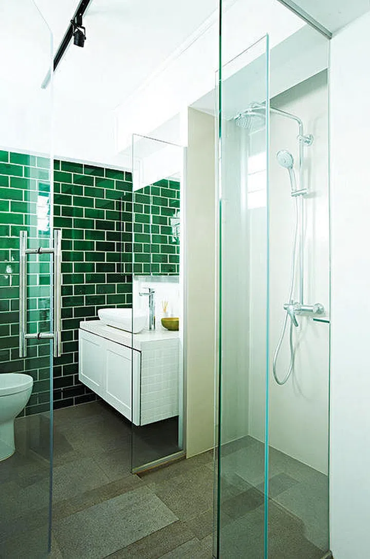 Selecting a bright green subway tile immediately adds interest into this otherwise all-white bathroom.