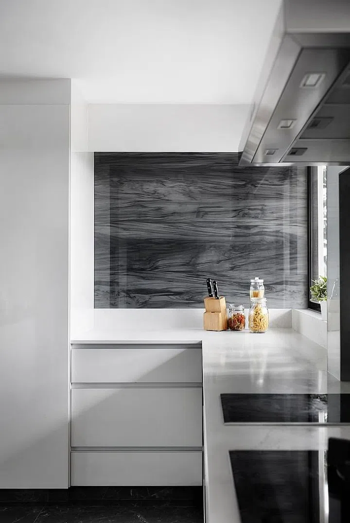 Amilia says, "The white marble look is very popular for flooring and wall finishes, be it in natural stone or simulated marble in porcelain tiles and surface tops. Last year, I designerd a Japanese-inspired kitchen with dark umber-toned cabinets and bold marble-like textured porcelain tiles for its backsplash that look like Japanese calligraphy strokes on the wall."