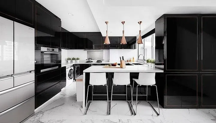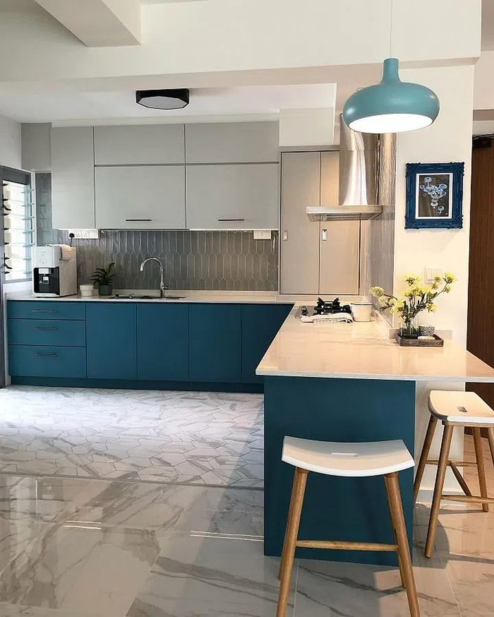 Amilia Gani, principal designer of Facelift Design, adds, "Keep the island or peninsula counter the same height as the rest of the kitchen counters to make the kitchen look spacious."