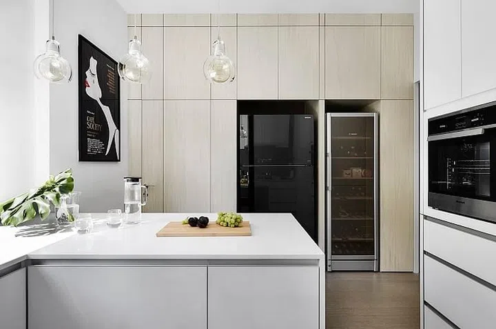 Another way to achieve a more polished and neat space is to have tall appliances like ovens and fridges on one side of the kitchen, and sink, hob and food prep countertop on the other. "A long counter top will always make the kitchen visually spacious," says Amilia.