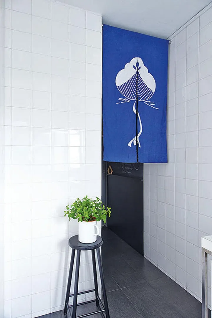 A Japanese curtain, or noren, is a traditional way to lend a space some privacy without shutting it off completely, such as in this home by J+A Design.