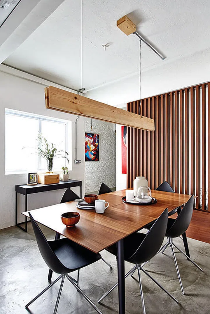 Sometimes, simple is best – like this slatted wooden screen in this walk-up apartment, that gives the dining area some measure of privacy.