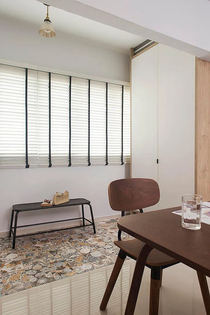 2. Different flooring, rather than paritions that can block out light, is used to zone space — the change in floor finishes helps to demarcate the entrance and dining areas.