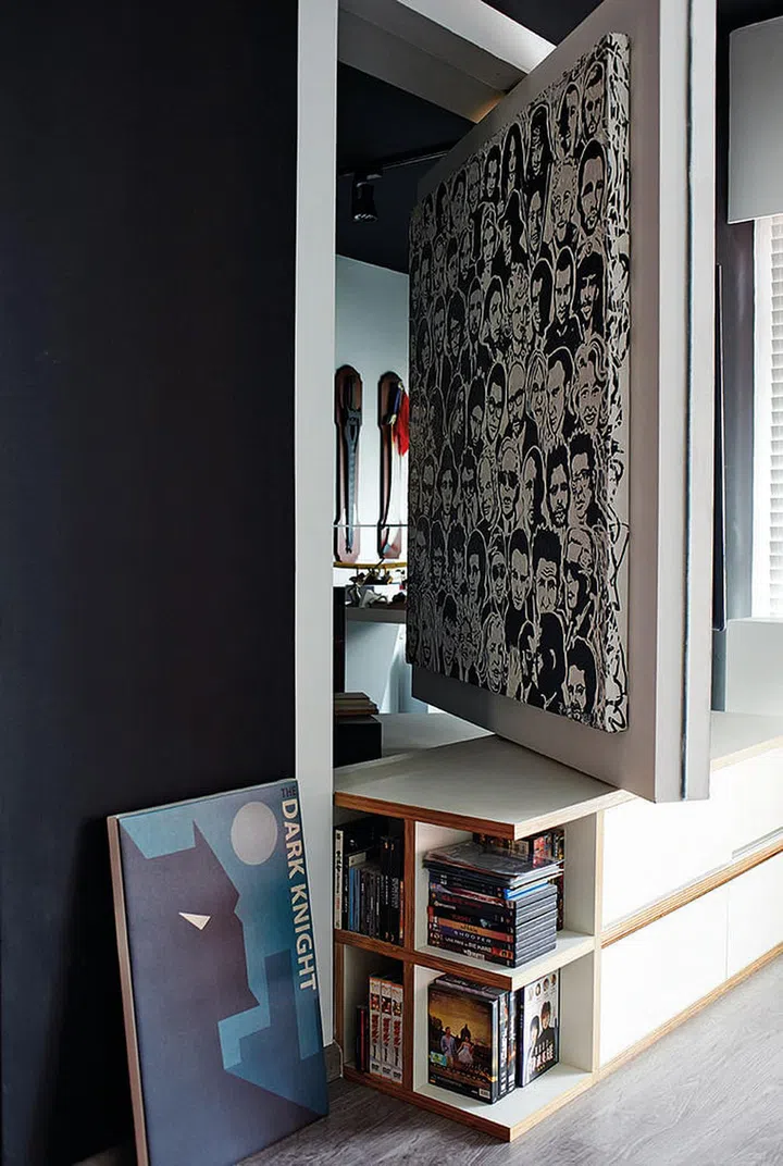 4. Save space and money — design a rotatable parition for your TV to be used in two adjacent spaces. All you need is one TV and one TV console!