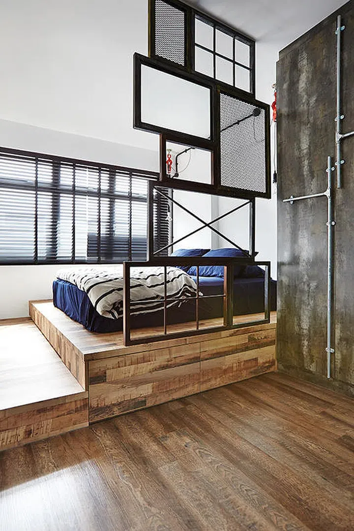 1. The sleeping area of this bedroom is elevated, with platforms, for a cosy feel and a better view through the windows while lying down.