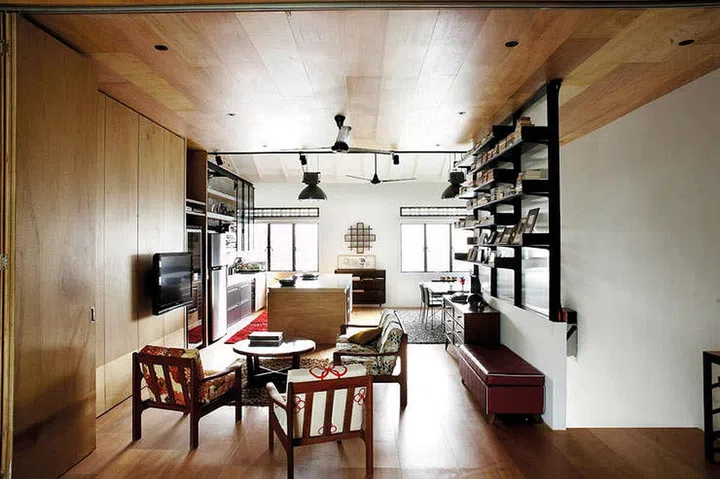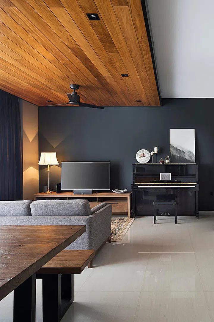The false ceiling in this apartment is cladded in wood, lending it a touch of the loft-style look, while drawing the eye up, adding warmth to the home, and complementing the darker shades on the wall.