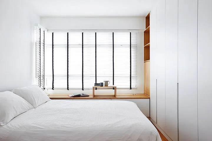 Orderly straight lines make the bedroom of this five-room HDB flat look clean and uncluttered, but not flat - the wooden ledge and shelves provide a nice contrast to all the white. Design by One is to One.