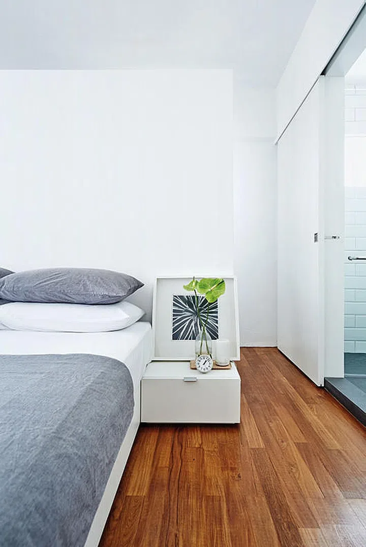 Clean unadorned pure white walls lend this HDB flat bedroom a serene meditative atmosphere. Even the bedside drawer is a simple white box. A splash of green adds liveliness to the space. Design by Jay Ang.