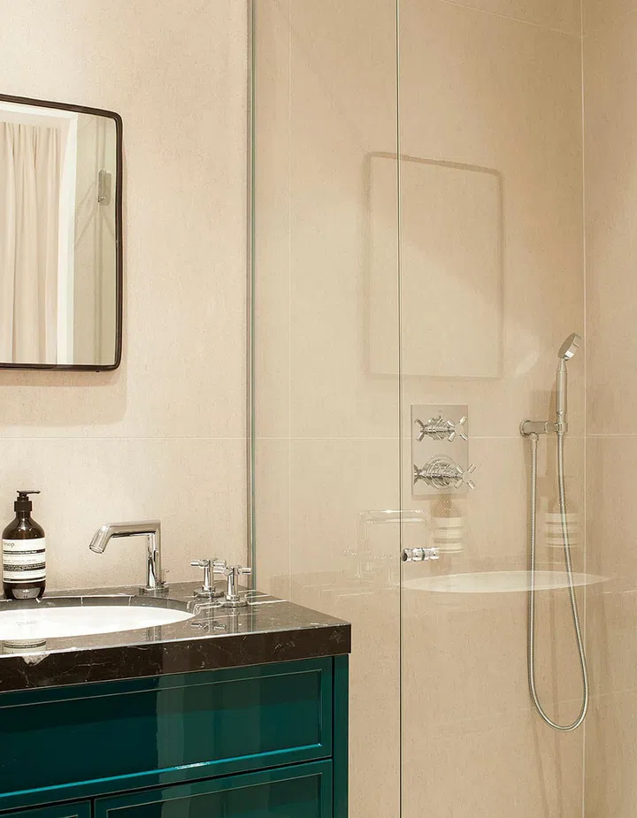 The black Nero Marquina marble helps add depth to the space. Designed by Plattform Studio.