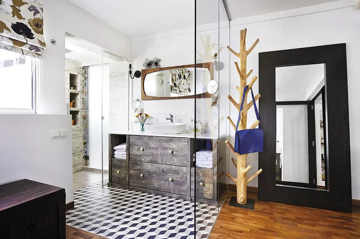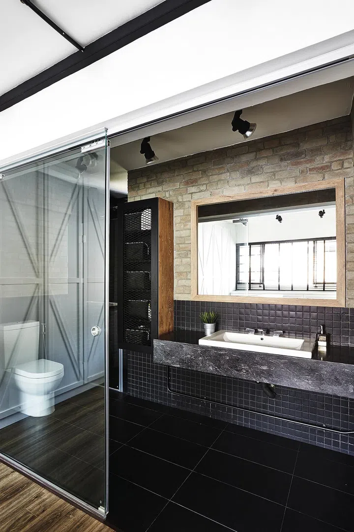 The washbasin is brought out into the bedroom, and a marked difference in flooring helps to visually zone the open bathroom.