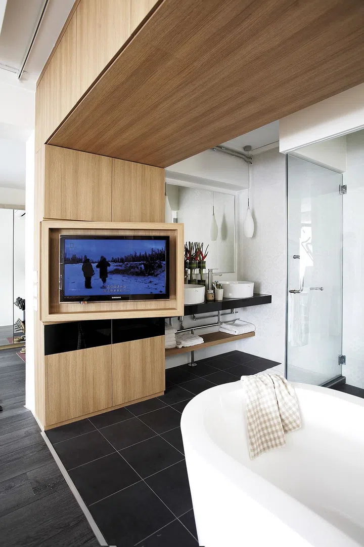 Boundaries between the bedroom and bathroom are blurred here, and the TV set can be used in both spaces.