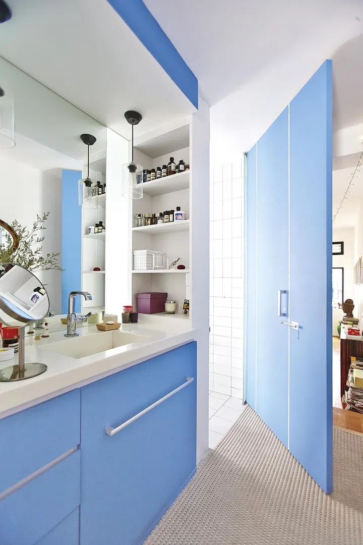 A large pivot door turns this narrow corridor into part of a larger bathroom. An open, and also flexible, concept!