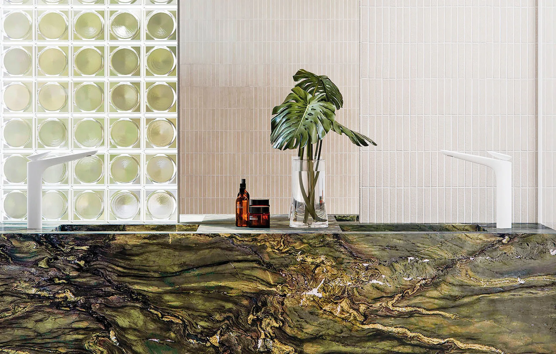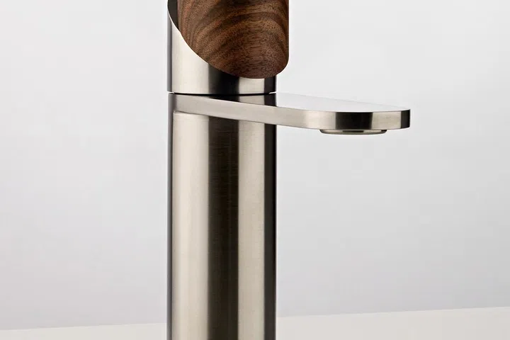 With its elegant design, finishes, and refined mechanism, the Slide mixer is bound to be a topic of conversation when you entertain guests. Just a little pressure of the fingers to slide the inclined plane handle turns the water on. Press downwards to adjust the flow. This elegant design is available in single-hole, three-hole, and wall-mounted versions. It is also available in brushed gold, champagne, and bronze finishes, as well as marble and wood handles.