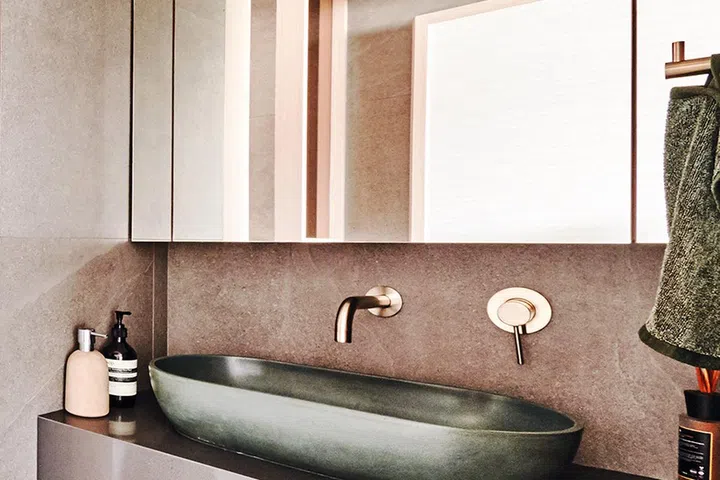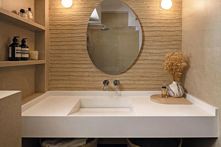 A bathroom sink customised to the exact dimensions of your bathroom and carpentry has many advantages. Customisation comes at a cost, but when it is customised to your space, you make the most of every inch. The washbasin can also be customised according to the needs of the household members. They are typically made of solid surface, concrete or natural stone.
