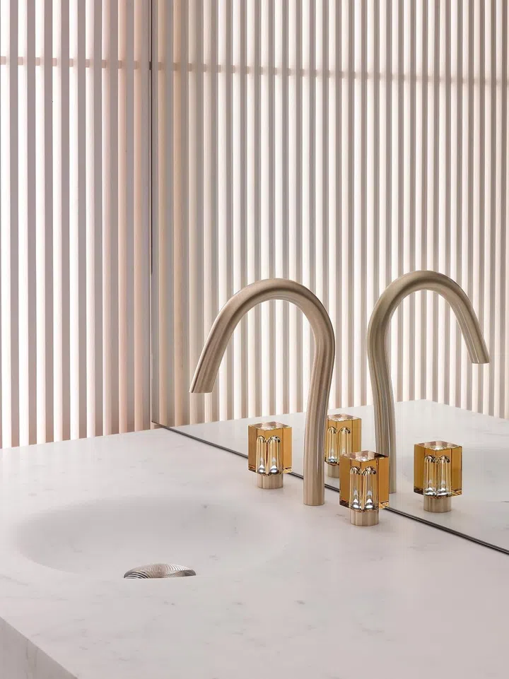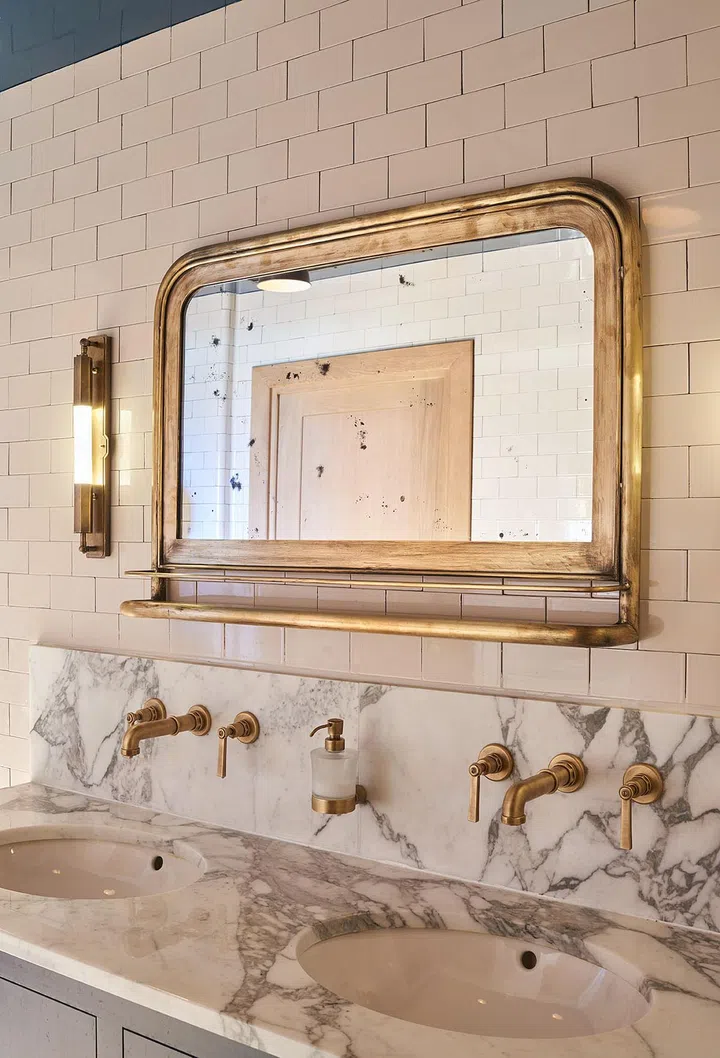 Gold and marble always works. This was designed by Laura Gonzalez, using French brand THG's gold-finished fittings.