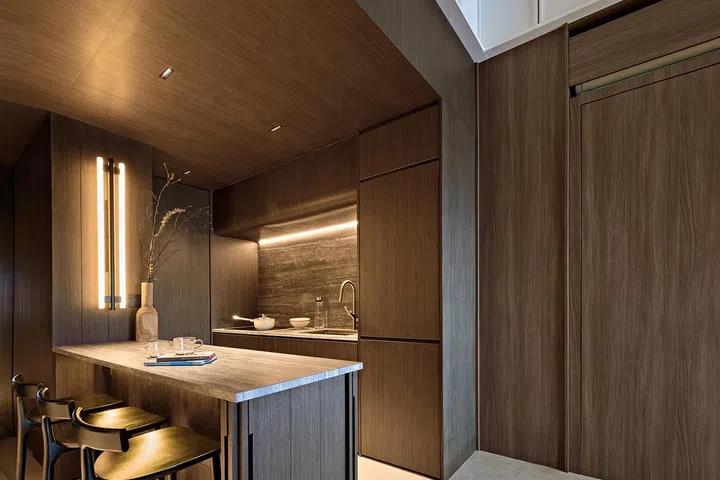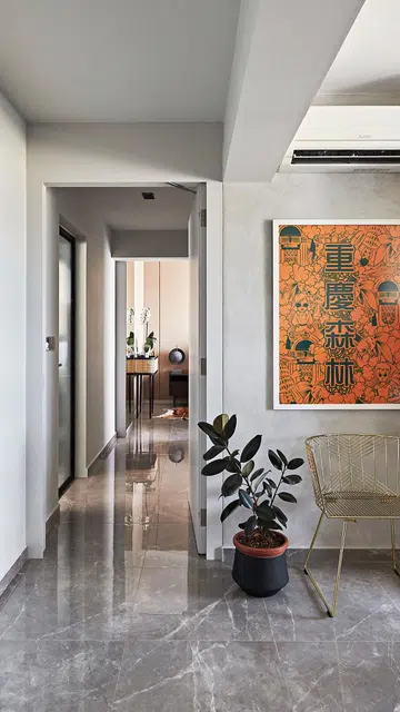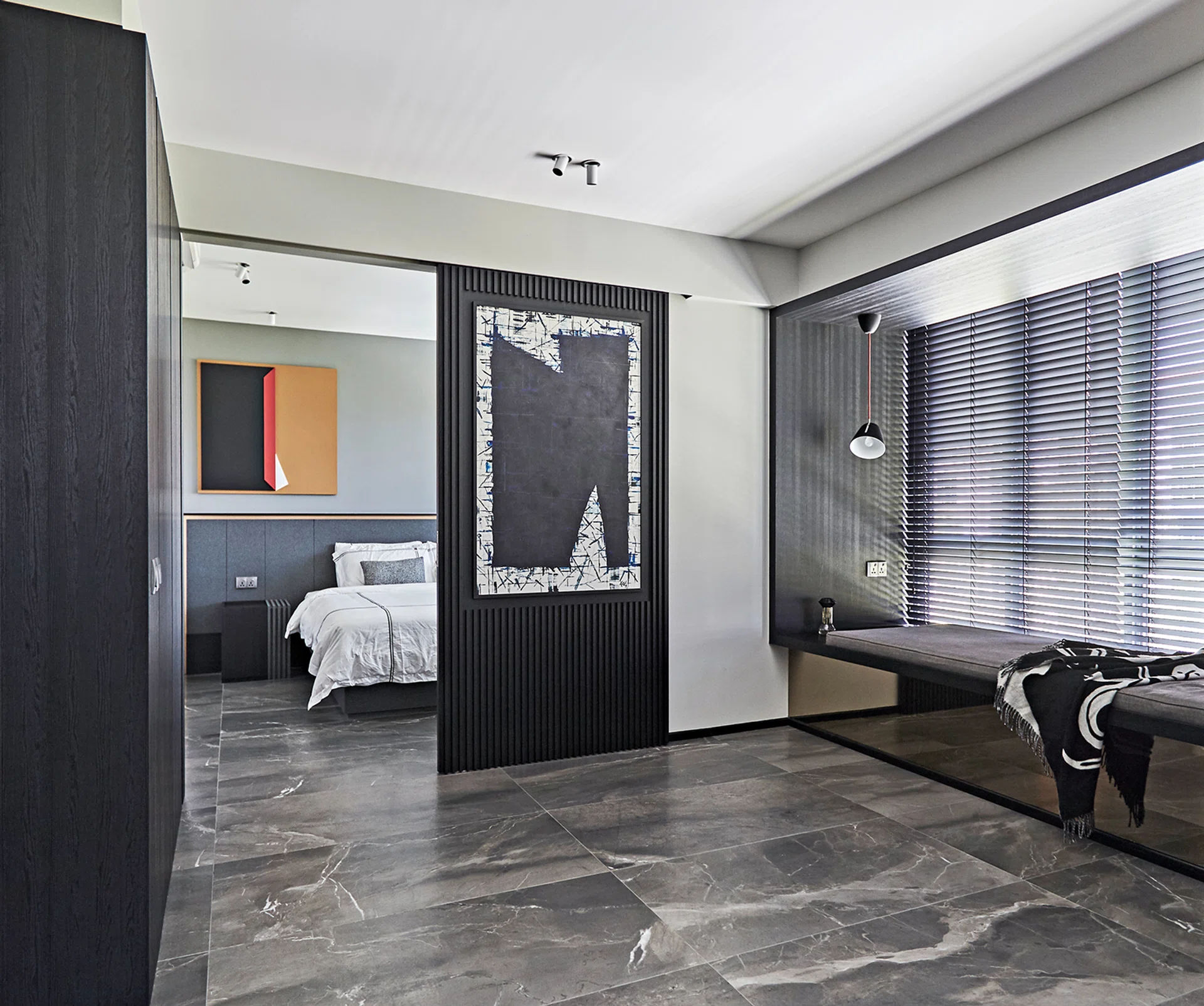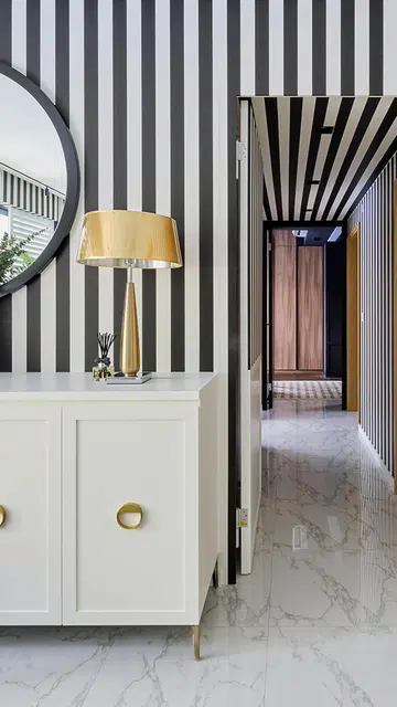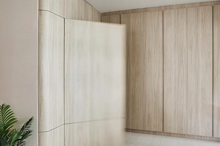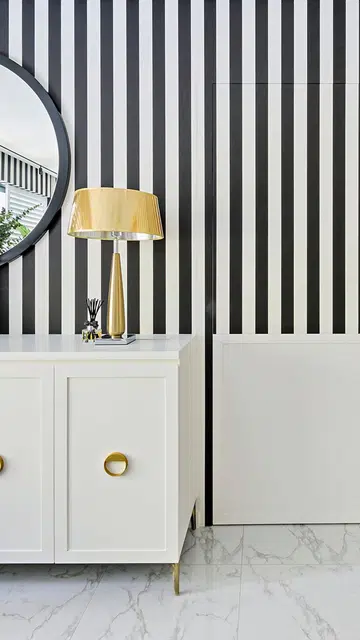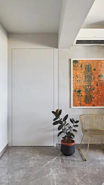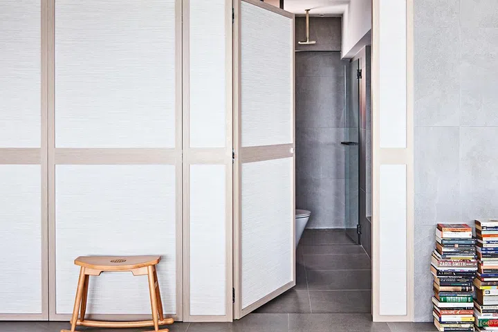 Transitional spaces are typically underutilised. When there are entrances to the bathroom or storeroom, these spaces are often overlooked in the overall interior design. Covering the walls and concealing the doors creates a sleek and neat design. Additionally, dressing up the walls elevates the role of such spaces in connecting and pulling together the various spaces in the home.
