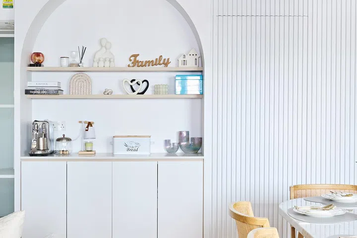 Concealed doors allow a beautiful and seamless backdrop, particularly beneficial in areas like the dining area or study corner within the living area. They affect how you feel in the space, and they give you a background you love when you have online meetings. The customised concealed door blends with the vertical grooves found in the coastal or farmhouse style.