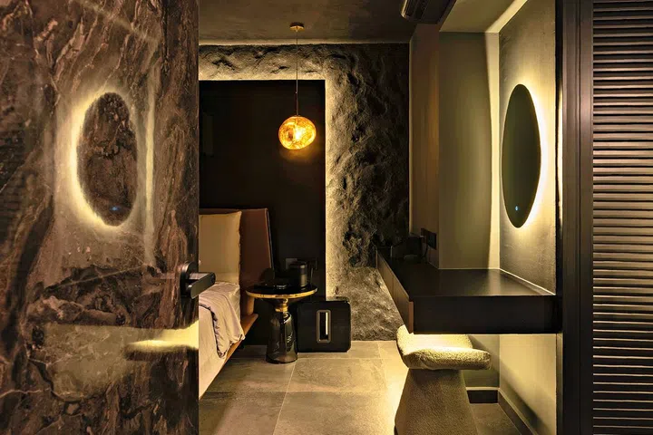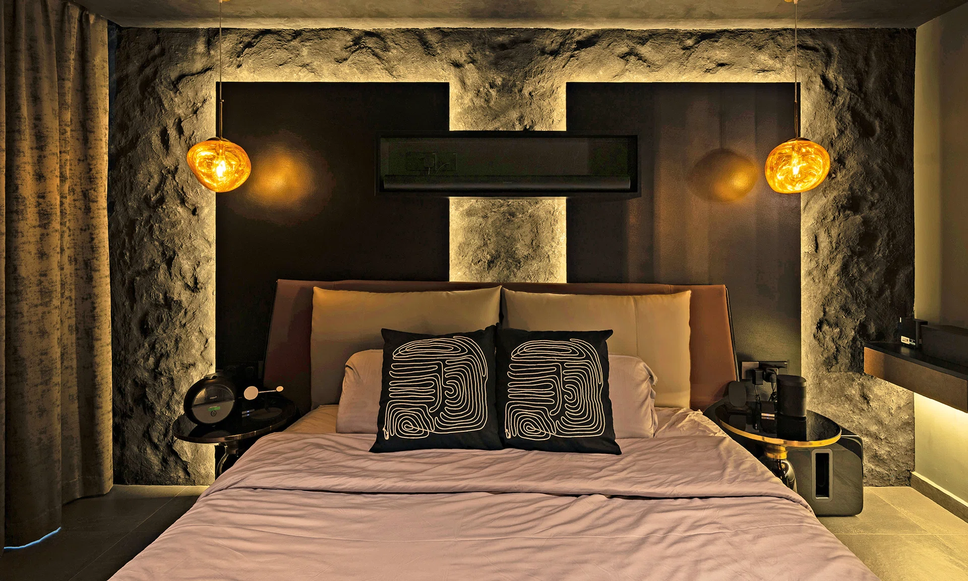 To mitigate the harshness of a dark bedroom, introduce warm lighting and soft furnishing to make it cosy and inviting, like a cocooning sanctuary that is closed off from the outside world. Integrating LED light into carpentry such as open shelves help to offset some of the darkness, as do “bling” elements that also make the room feel more sophisticated. Reflective materials such as metallic laminates, mirrors and glass acrylic reflect light to make the space feel less claustrophobic. Instead of just regular walls, Carmen suggests going for dark coloured, patterned wallpaper or 3D wall panels for added visual interest and depth.