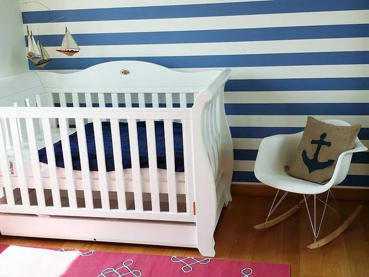 Stripes: The nautical themed room is the perfect colour for a growing child, and the white strips help soften the blues, keeping the room light with an interesting feature wall.