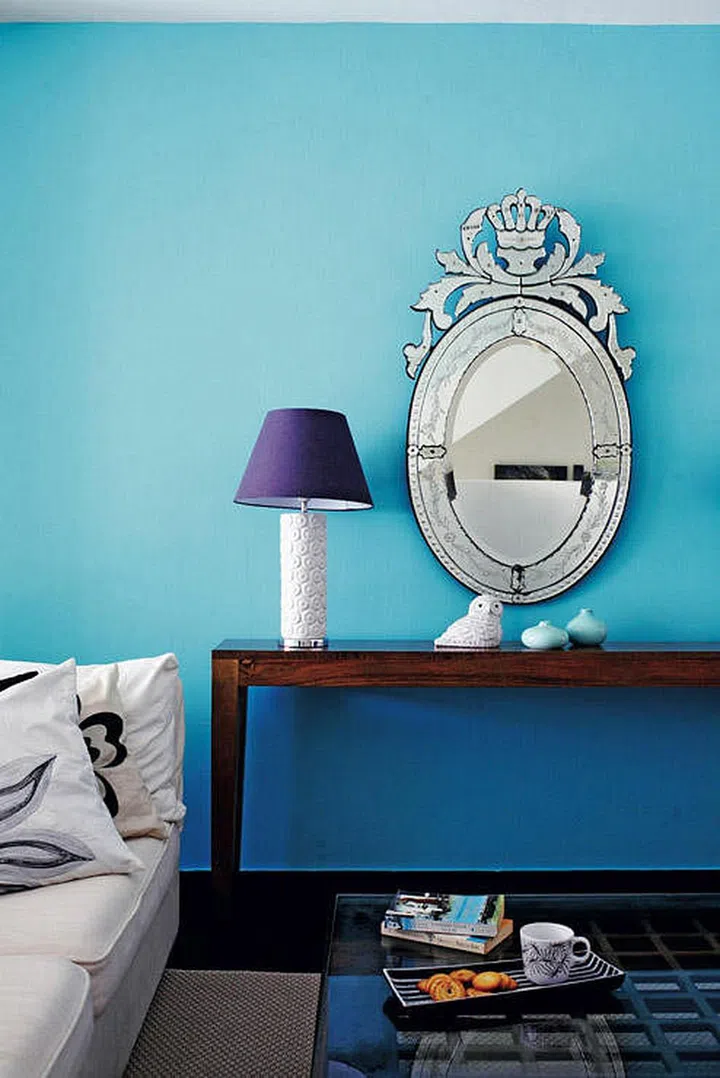 Play with shades: The bright blue against the pale lilac brings a nice contrast to home.