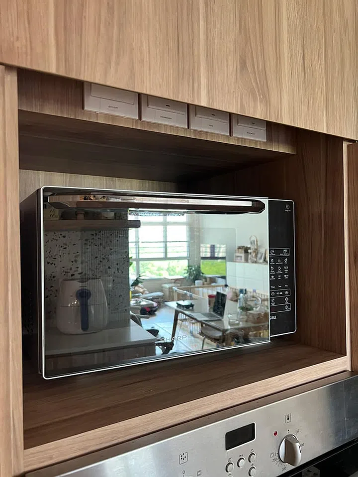 We engaged a professional and experienced electrician that helped us with our electrical works, where he gave us a brilliant suggestion of hiding our electrical switches within kitchen carpentry. The considerations behind installing electrical switches are mainly easy accessibility, while keeping the unsightly switches from being too jarring at the same time.