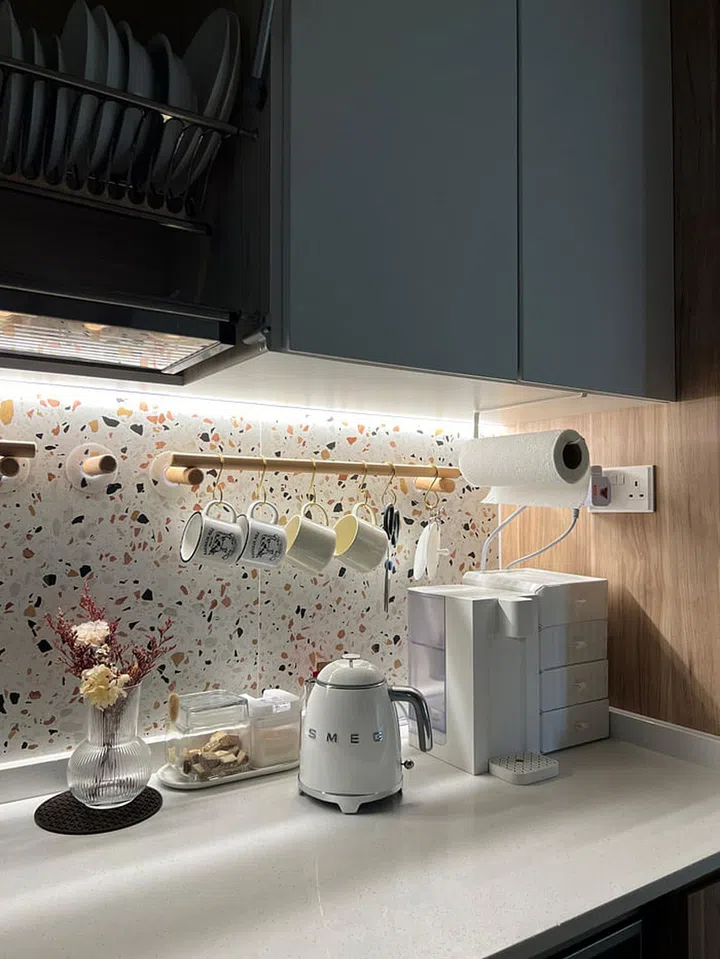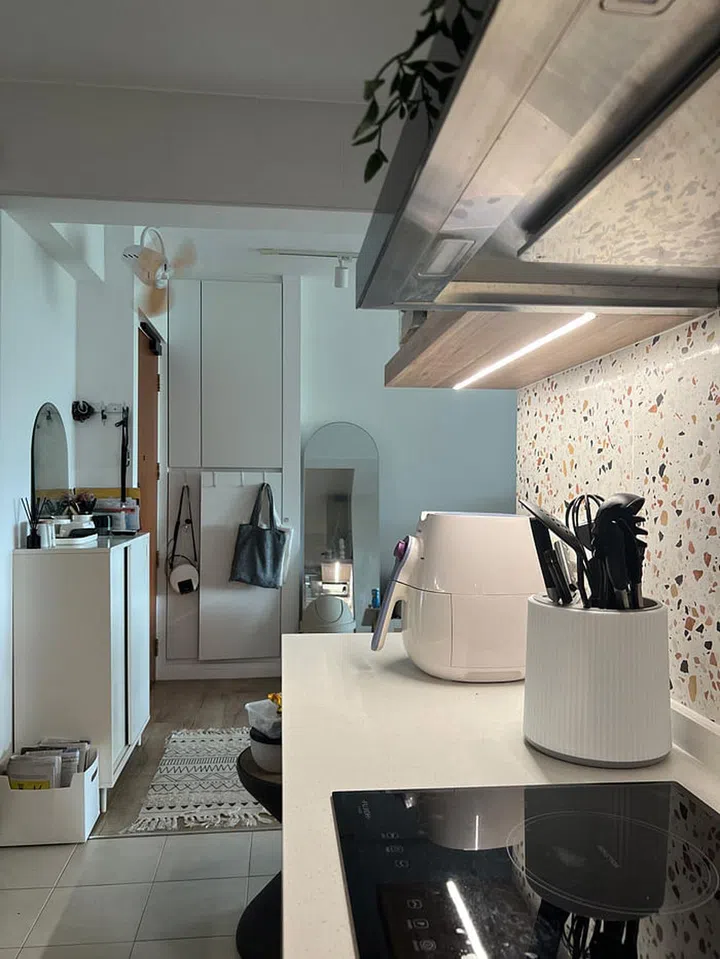 When we purchased the resale unit, the original homeowners had either knocked down or opted out of kitchen doors. We loved the idea of an open-concept kitchen since it helps to open up the living space. A chimney hood with high extraction strength is in place to stop the cooking fumes from spreading to our sofa and curtain in the living room.