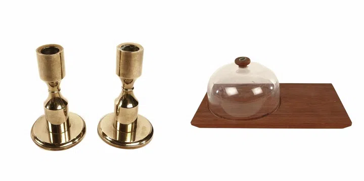 6. 1900s' brass candleholder, $150, and 1950s' cheese platter from Denmark, $80, from Mobler.