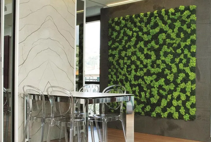 In tile format, this is a natural preserved lichen for interiors, and can be easily installed and shaped. The moss is collected without any damage to vegetation and processed using non-toxic substances. Because it doesn't grow, it doesn't require watering, pruning or sunlight. It comes in 9 colours.