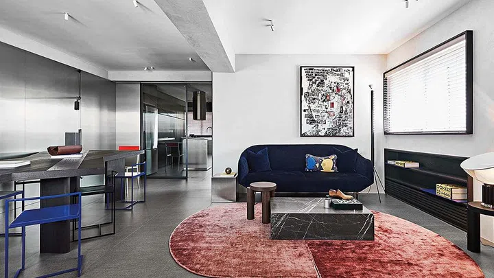 Pops of cobalt blue and playful geometric shapes—such as half-circle rugs and avant-garde artwork—contrast with the industrial textures of the kitchen’s stainless steel and rippled quartz. By prioritising balanced proportions and layered textures over purely expensive materials, the renovation successfully modernises the aging 3-room footprint into a luxurious, art-led sanctuary tailored for a single occupant.