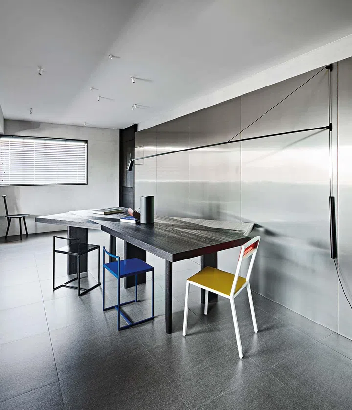 The home’s design focuses on unity and visual depth, using repeated materials and custom furniture to create a sense of order. The centrepiece of the living space is a bespoke 2.5-metre-long angled dining table that serves as a versatile hub for dining, working, and meetings.