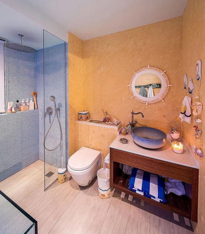 The couple is most proud of their two bathrooms, of which the master bathroom is inspired by the Maldivian beach villa the couple stayed in that stood over the ocean.