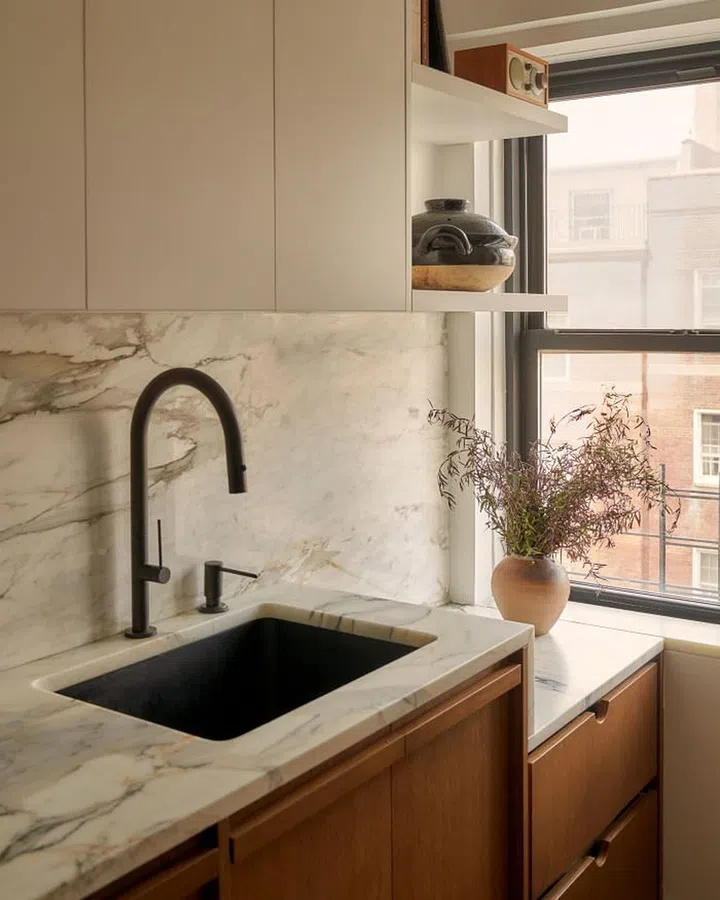 It invites more light to pour into the space, while still making use of it for storage. “In this apartment, it became a great place for the homeowners to have their favorite cookbooks and beloved specialty pots easily accessible and proudly on display,’” says Claire. Here, you can see how the top shelves next to the window were rounded off, no only does this allow you to extend the counter all the way to the window, it also means you can turn this normally wasted space into a small display nook.