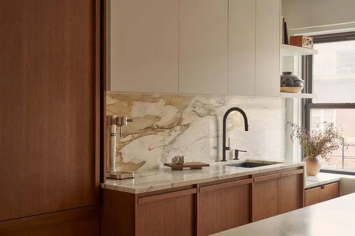 Choosing a neutral palette for the backdrop of your home is a good way to never get tired of it and be able to change accessories along the way, introducing pops of bold colors and artworks according to your taste and mood. In this apartment, Hung opted for honey-toned floors, dark chocolate oak cabinetry and Italian marble to create a timeless and elegant atmosphere.