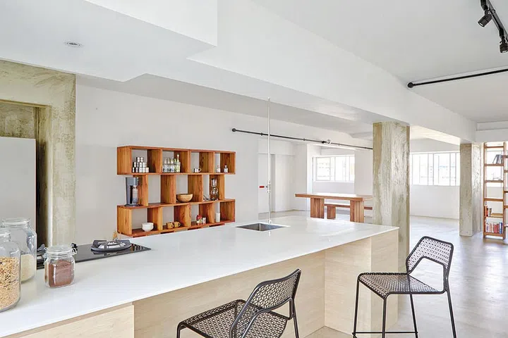 6. Suspended open shelving, above the kitchen island — provides easy access from both sides.