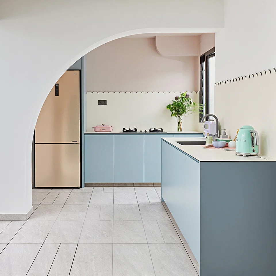 matches with the laminates used and countertop. If your countertop has a lot of veins, speckles, or colour variation, it might be better to go with a simpler backsplash and vice versa. Having a coherent style is not just about the carpentry and laminates, as backsplash choices can make or break the overall vibe. For example, if you are aiming for a wabi sabi theme, you may not want a tempered glass backsplash as it will look too modern, even though it may be easier to clean. - Soh Hui Ling, Design Head at BuildBuilt